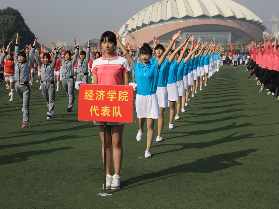最美不过经院蓝。开幕式上,我院方阵代表队身穿亮眼夺目的蓝白运动服,高举“经院健将,劈波斩浪,气贯长虹,力破苍穹”的口号牌;蓝色的院旗下,广播操代表队以整齐划一的动作,昂扬向上的精神面貌,充分展现了我院师生超越自我,青春无畏的心声。