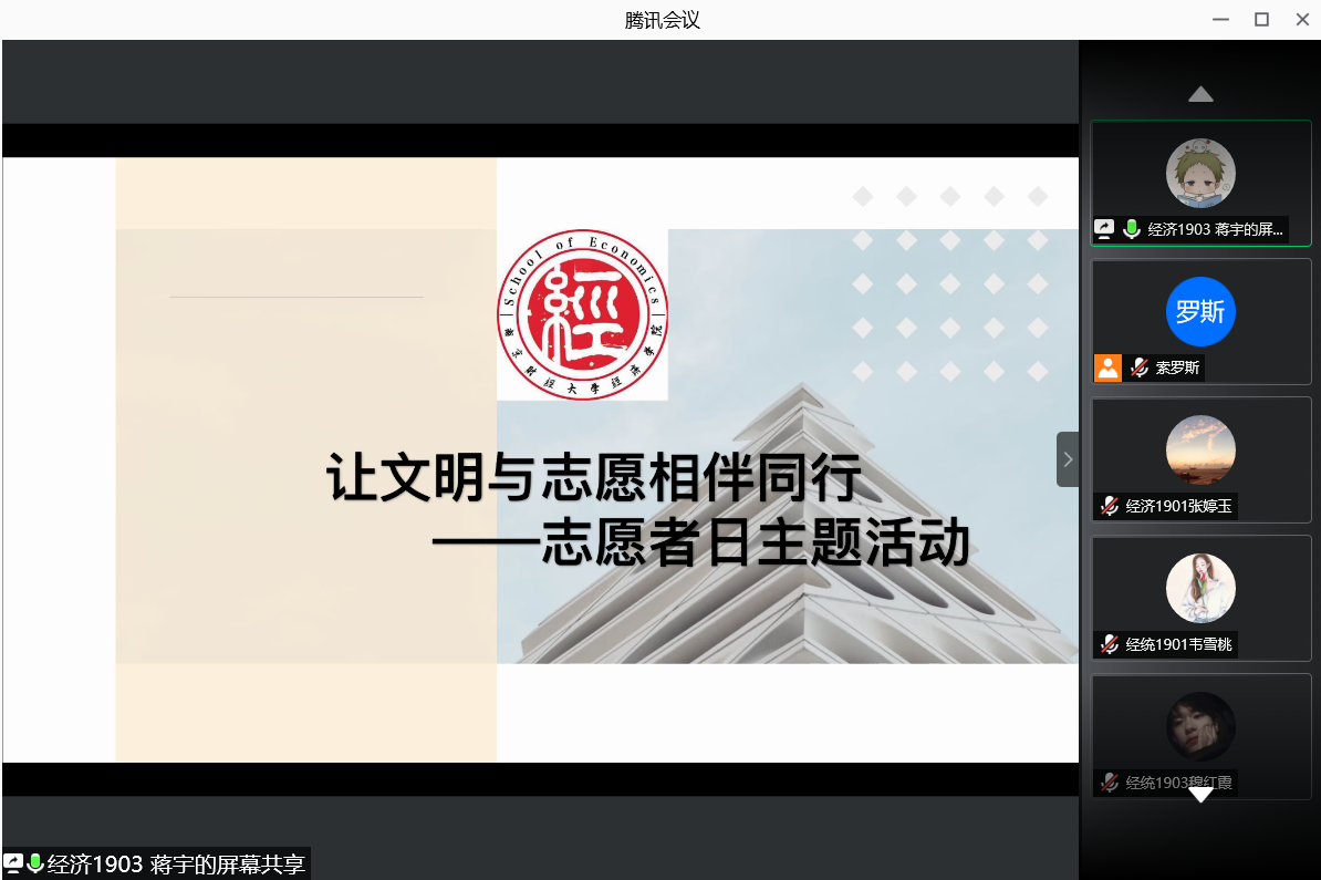 活动由经济学院学生会发动组织,活动开始,由服务维权部部长蒋宇同学向大家汇报活动主题、流程、目的意义,展示学院志愿服务活动照片合集视频,并向同学们介绍了此次参与分享活动的志愿者代表。