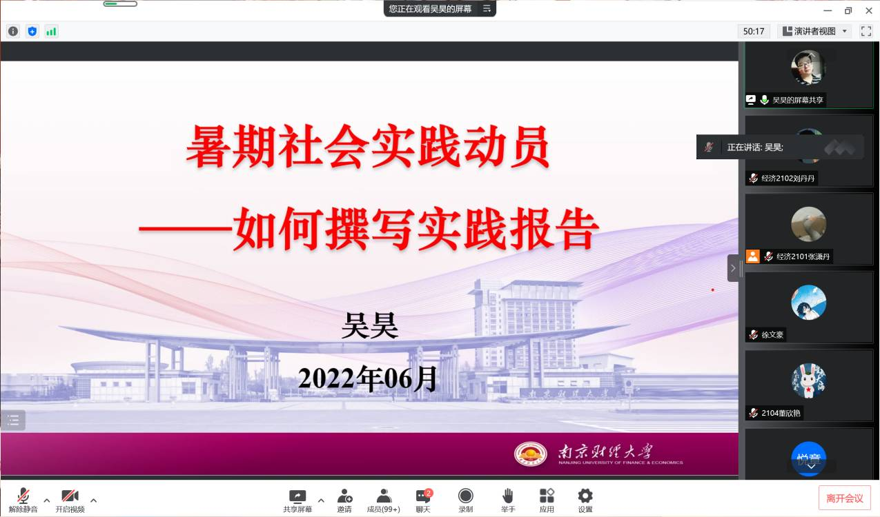 为进一步加深大学生对基层工作的了解鼓励大学生参与实践、走进基层、发挥自身专业特长和聪明才干,号召大学生为家乡的发展助力,6月1日晚,我院于线上召开“躬行实践,知行兼举”——经济学院2022年暑期社会实践动员大会。本次大会邀请我院党委副书记袁怡琨,优秀指导教师吴昊老师,校团委副书记(挂职)、我院辅导员梁少颖老师以及我院团委书记潘怡老师进行讲解说明,往期优秀项目负责人同学分享实践经验,全院两百余名同学参加活动。