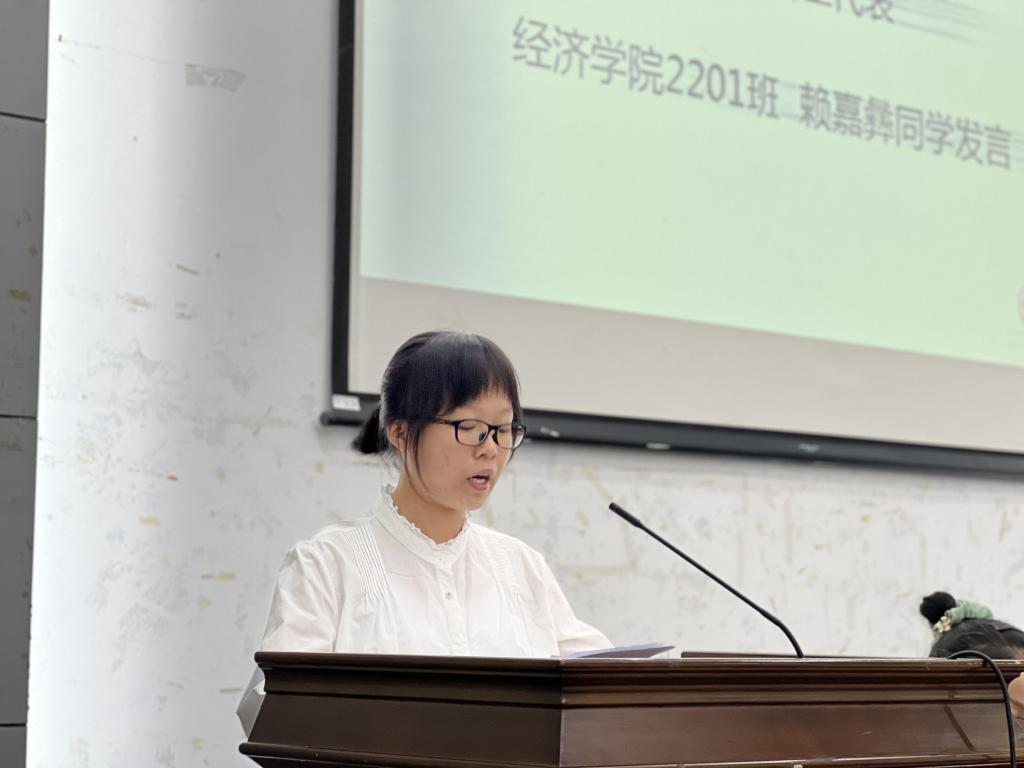 本科生在校生代表数统2001班桑海瑞从学校、学院、专业和生涯发展等四个方面和新生分享应如何度过大学四年。研究生在校生代表2020级经济思想史专业齐啸宇以南财校训与全体新生共勉,希望大家能在南京财经大学的沃土中,练就出过硬的本领,创造出更加辉煌的明天。本科生新生代表2201班赖嘉彝号召全体新生珍惜时光,把握机会,且行且思,不驰于空想,不骛于虚声。在对专业的潜心学习中,掌握知识,播种热爱,收获喜悦,不坠青云之志,永存赤子之心。研究生新生代表2022级应用统计专业祝千茜从自主性和创新性两个方面表达了对研究生阶段的向往和期待,希望在新的求学之路上活出卓越与非凡、充实与精彩。