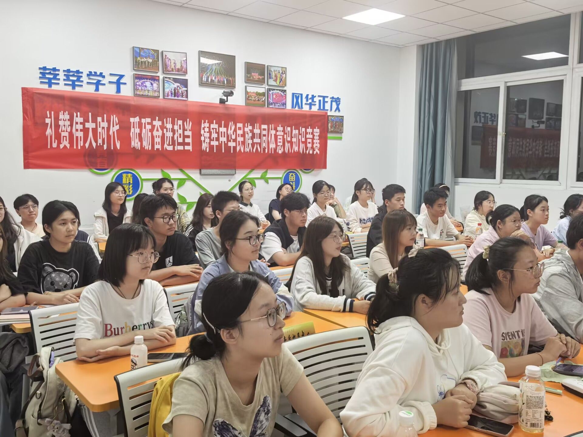 金风送喜,举国同庆。为庆祝新中国75周年华诞,强化中华民族共同体意识,深入学习贯彻党的二十届三中全会精神,贯彻落实习近平总书记关于加强和改进民族工作的重要思想,深入推进民族团结进步宣传教育工作,持续铸牢中华民族共同体意识,9月27日,我院于博文楼104教室开展“礼赞伟大时代,砥砺奋进担当,铸牢中华民族共同体意识”知识竞赛。活动通过集中授课和知识竞答相结合的方式,学习贯彻习近平总书记关于加强和改进民族工作的重要思想,开展党的民族政策法规宣传教育,大力营造爱党爱国爱社会主义的浓厚节庆氛围。本次活动由2024级本科生辅导员张闻老师主讲团课,部分大一、大二学生参与活动。
