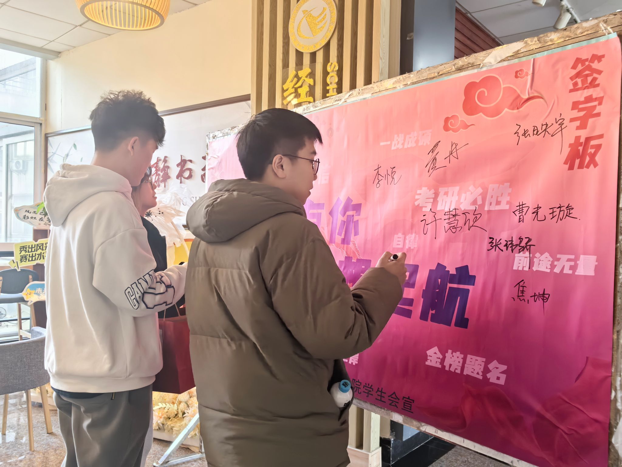 随着2025年全国硕士研究生招生考试的临近,考研学子们正在做最后的全力冲刺。为了帮助他们缓解压力,鼓舞士气,坚定迈向考场的信心,经济学院于 12月16日中午在德经楼静书斋举办了一场温馨的“研途有你,梦想启航”考研送温暖活动,为即将踏上考场的全体考生送上真挚的鼓励与祝福。