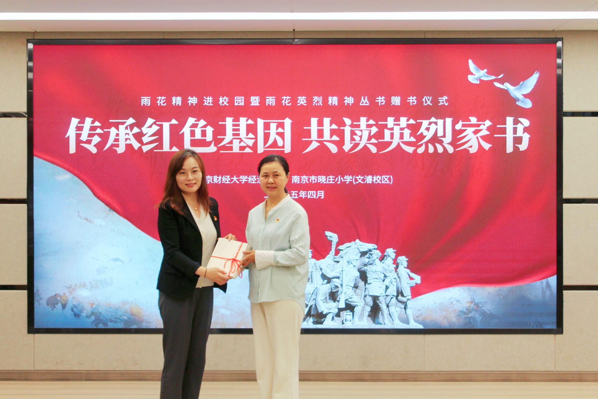 2025年4月9日,我院与南京市晓庄小学(文濬校区)联合举办“传承红色基因,共读英烈家书——雨花精神进校园暨雨花英烈精神丛书赠书仪式”。此次活动作为南京财经大学联合南京市雨花台烈士陵园管理局举办的“革命俊彦·高校荣光——雨花英烈中的青年学子”专题展暨雨花英烈事迹与精神丛书展的子活动之一,以红色文化为纽带,通过大中小学联动、师生共读等形式,生动展现了南京财经大学在推进思政教育一体化建设中的创新实践。