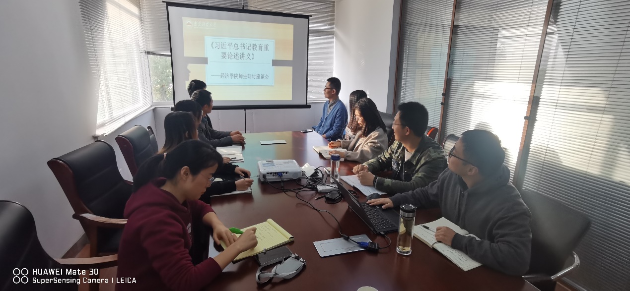 10月16日下午,经济学院在职教师在学院党委的组织下,在德经楼307会议室通过远程视频会议的方式聆听了现任浙江外国语学院党委书记宣勇教授宣讲的《习近平总书记教育重要论述讲义》专题学习会。