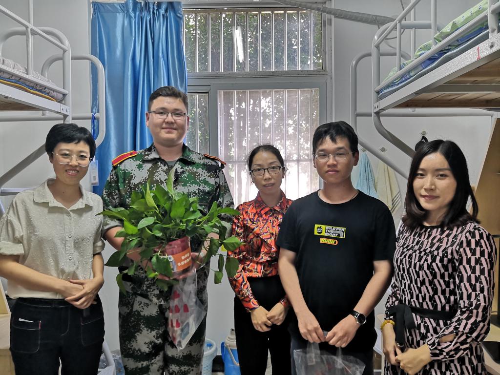 国庆和中秋佳节在即,为了让刚入校的2020级新生欢度更快适应环境、欢度大学里的第一个节日,感受到来自学院的温暖,9月23日中午,我院党委副书记袁怡琨老师、学工秘书尹海燕老师、新生辅导员陶海韵老师和院学生会的同学们来到学生宿舍,为每个小寝送上绿萝,并为每个新生带来中秋月饼、消毒湿巾等节日礼品。