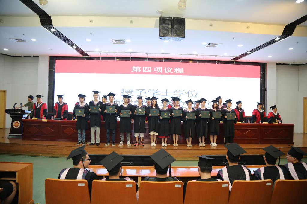 随后,副院长张成宣读了《关于授予2019届本科毕业生学士学位的决定》。在明快的音乐中,2019届毕业生们依次上台。与会领导和老师们与毕业生们热情握手,为毕业生拨正流苏、颁发硕士学位证书和学士学位证书。