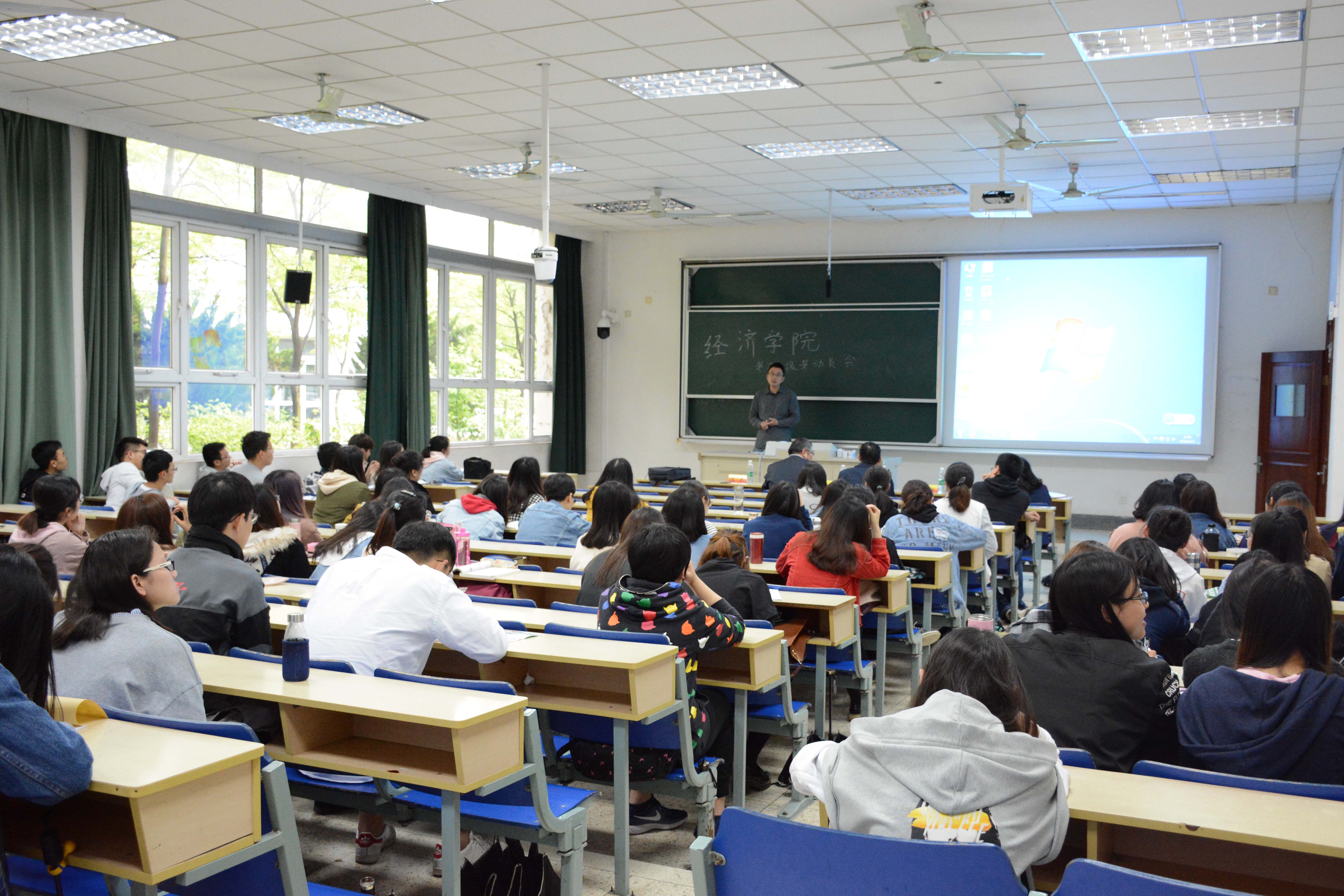 王庚老师首先结合经济学院专业设置实际,鼓励同学们报考经济学和管理学以下的各类学科分支。在专业和学校选择方面,他提出科学选择的“5+3”,即你能考什么学校、你未来想从事的事业、何处定居、这地方可供选择的学校和专业和你想报的学校五个问题,以及专业排名、招生人数和复试分数线三个参数,综合分析考研的选择策略以供同学们参考。