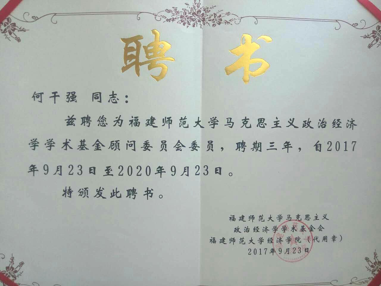 在会议期间,还举办了福建师范大学马克思主义政治经济学学术基金顾问委员会成立暨聘任仪式,我院何干强教授、周绍东教授受聘为顾问。据悉,该基金是由福建师范大学经济学院校友余文辉博士捐款100万元设立的学术奖励基金,顾问委员会由包括著名经济学家卫兴华教授在内的22位全国知名政治经济学专家组成。