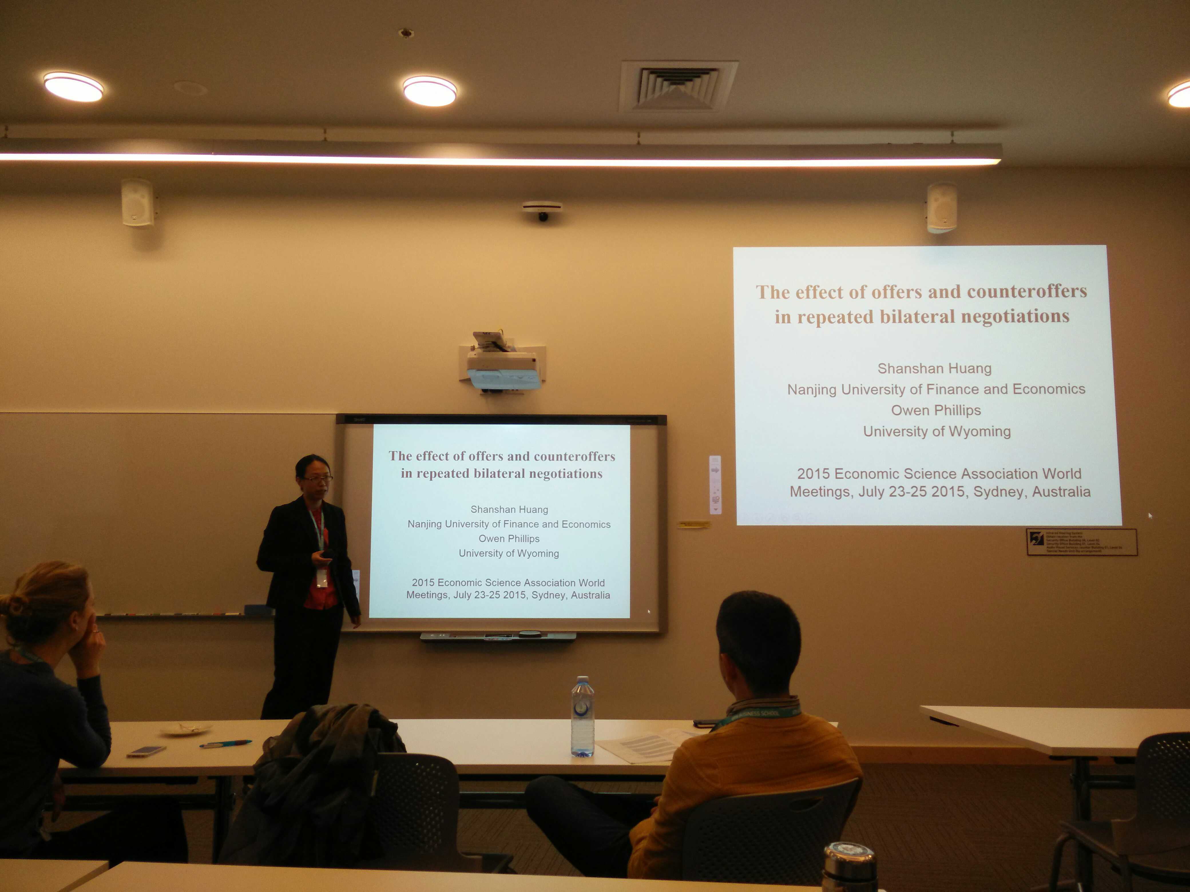 7月20日,经济学院黄姗姗博士远赴澳大利亚悉尼参加2015届经济科学协会世界大会(Economic Science Association),并作题为“讨价还价在重复性双边商业谈判中的影响”的学术报告。