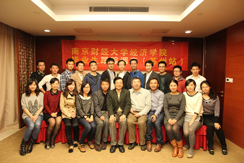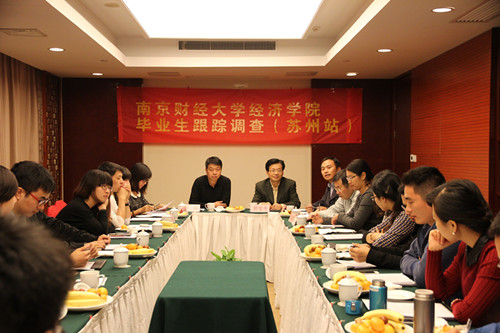 为进一步了解毕业生的就业、学习和生活情况,掌握毕业生的思想动态,更好地开展毕业生教育、管理和服务工作,2013年11月2日,南京财经大学经济学院在苏州召开了毕业生座谈会,院党委书记胡荣华教授,统计系教师陈耀辉教授、李刚教授,学工秘书徐山昌老师,研究生秘书王顺善老师,辅导员尹海燕老师、黄晓娟老师及毕业生代表20余人参加了座谈。师生就大学四年的收获,学校在教学、学生管理中可以改进的方面,工作中遇到的困难,以及希望学校为毕业生构建继续学习和交流平台等问题进行了广泛交流。