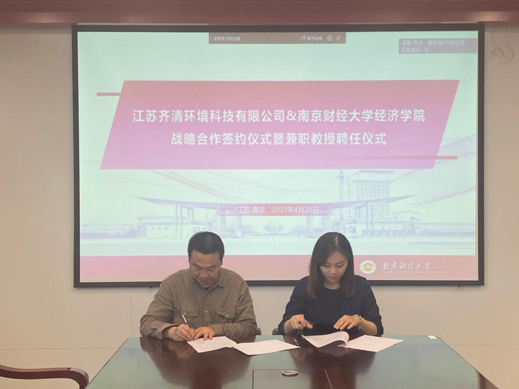 最后,朱红根院长与王志良董事长签署了《南京财经大学经济学院与江苏齐清环境科技有限公司战略合作协议》《南京财经大学经济学院与江苏齐清环境科技有限公司实习就业基地共建协议》,并聘任王志良董事长、李建军副总经理为绿色经济发展研究院兼职教授。根据协议,双方将在碳经济与管理交叉学科人才培养、师资队伍建设,碳经济理论与实践研究,流域环境治理、生态环境政策咨询,实习就业基地建设等方面开展深入合作。
