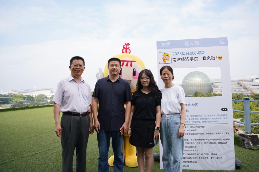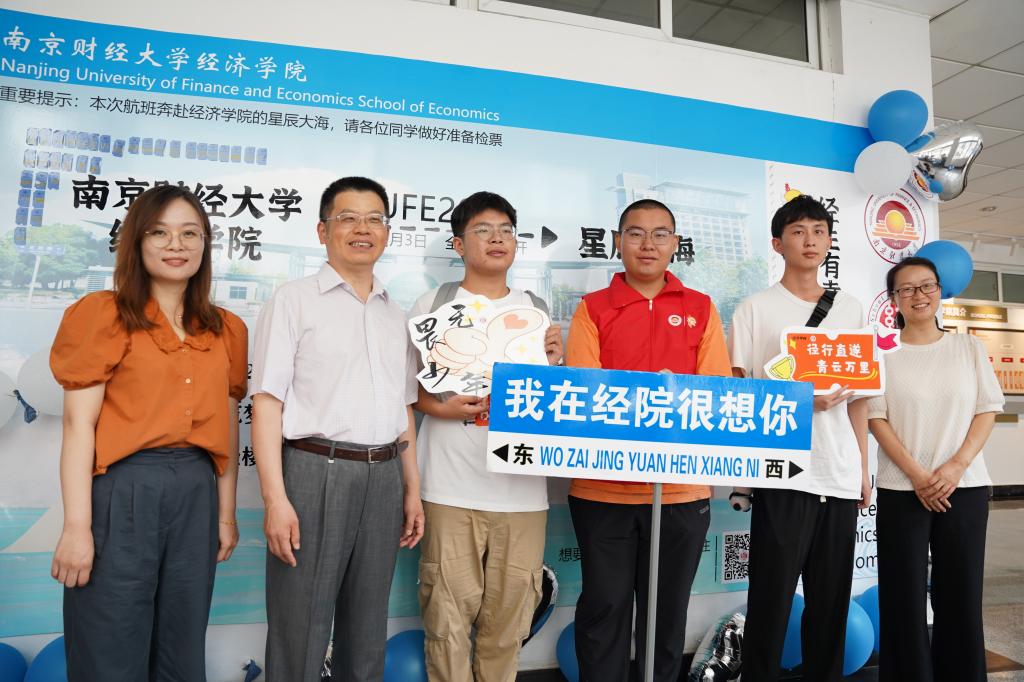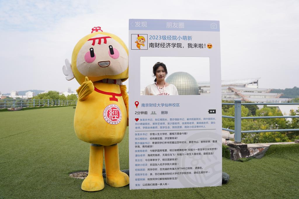 定制礼物,温暖满满。学院设置了从南财经济学院启航驶向星辰大海的“逐梦青春号”船票展板,学院的专业楼德经楼为船舱、新生们的学号为证件号,寓意经院学子们登船开启为期4年的学习时光,乘风破浪,扬帆远航,逐梦新征程。学子们在船票票根写下求学寄语并签名后粘在迎新墙上,更增强“榜上有名”的仪式感。学院还精心为新生准备了富有经院特色的入学纪念品,包含“小经灵”钥匙扣、船票票根、南财明信片、新生防诈骗指南以及定制帆布包等,通过温馨礼物的方式密切学生和学院的联系、培养爱校情怀,可谓仪式感满满!新生们纷纷与写满学院领导老师点赞留言的朋友圈打卡框、学院吉祥物“小经灵”和南财地标图书馆“大球”合影,开启缤粉多彩、有滋有味的大学生活。