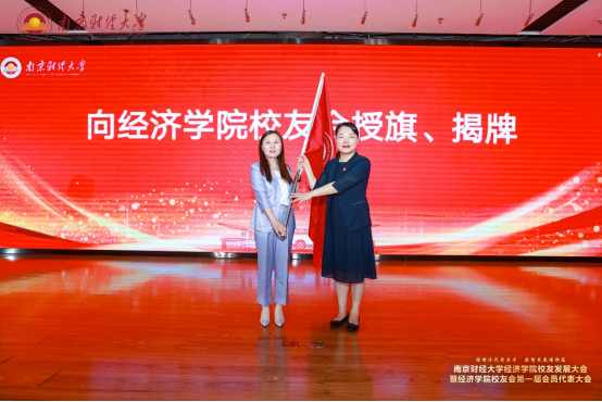 李煜副校长向校友会首任会长管有英授旗,叶林祥副校长、卢景波理事长共同为校友会揭牌。随后,李煜副校长为经济学院校友会名誉会长、会长颁发聘书,经济学院党委书记张圣兵为副会长、秘书长、副秘书长及监事颁发聘书。
