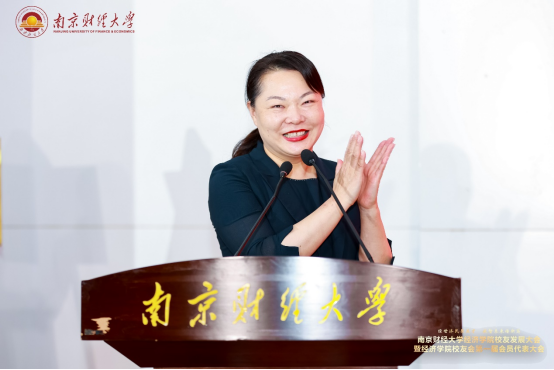 经济学院校友会第一届理事会会长管有英校友发言,她表示,将与理事会成员一起,以“服务校友、回馈母校、贡献社会”为宗旨,将经济学院校友会打造成为校友联络的情感纽带,支持在校学生成长的育人平台,反哺学校学院事业发展的永续引擎。
