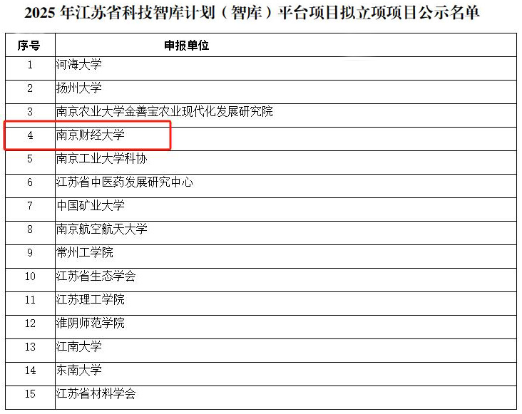 近日,2025年度江苏省科技智库计划项目遴选结果出炉,我校经济学院组织申报的2025年江苏省科技智库计划(智库)平台项目获准江苏省科学技术协会立项,南京财经大学被认定为江苏省科技创新智库基地。