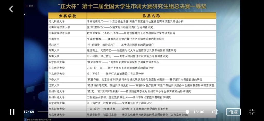 现场宣布第十二届全国大学生市调大赛研究生组总决赛一等奖获奖名单