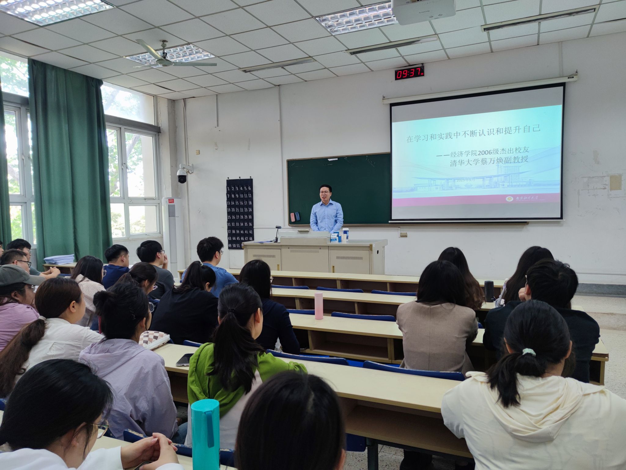 2025 年 5 月 24 日,南京财经大学经济学院校友发展大会成立期间迎来了三位杰出校友,他们分别是清华大学马克思主义学院的蔡万焕副教授、中共泰州市委办公室稽查室袁明副主任以及 AO 史密斯人力资源总监张玮先生。三位校友齐聚德经楼 105 教室,为经济学院研究生带来了一场关于职场发展与学术成长的思想盛宴,共同探讨多元发展路径。