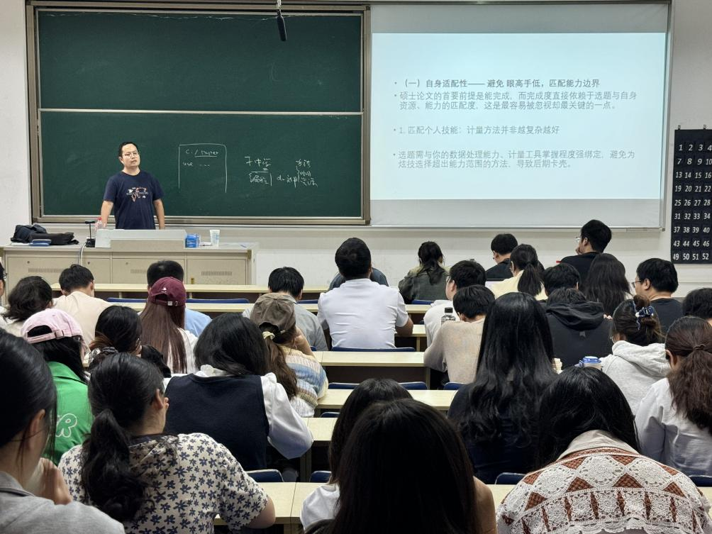 在明确三大核心任务后,苏华山副教授围绕各任务板块展开了细致深入的讲解。他结合自身丰富的科研经验与生动的学科实例,从理论知识学习的方法技巧,到实践研究中的数据收集、分析与处理,再到学术论文的选题、撰写、修改与投稿等各个环节,为在场研究生提供了具体且实用的方法建议。他的讲解深入浅出、通俗易懂,让在场研究生对学术研究的整个流程有了更为清晰的认识,也掌握了诸多可直接应用于实际研究的实用技巧。