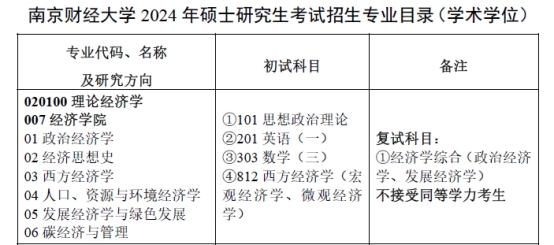 南京财经大学经济学院拥有应用经济学一级博士授权点,下设环境经济与政策、发展经济学、经济统计学3个博士招生方向,有理论经济学和统计学两个硕士学位授权一级学科。学院硕士研究生招生学科(专业)目前共4个:理论经济学(学硕)、统计学(学硕)、应用经济学(数量经济学方向,学硕)、应用统计(专硕)。2024年新增设交叉学科“碳经济与管理”,放在理论经济学学科下面招生(第6个研究方向)。