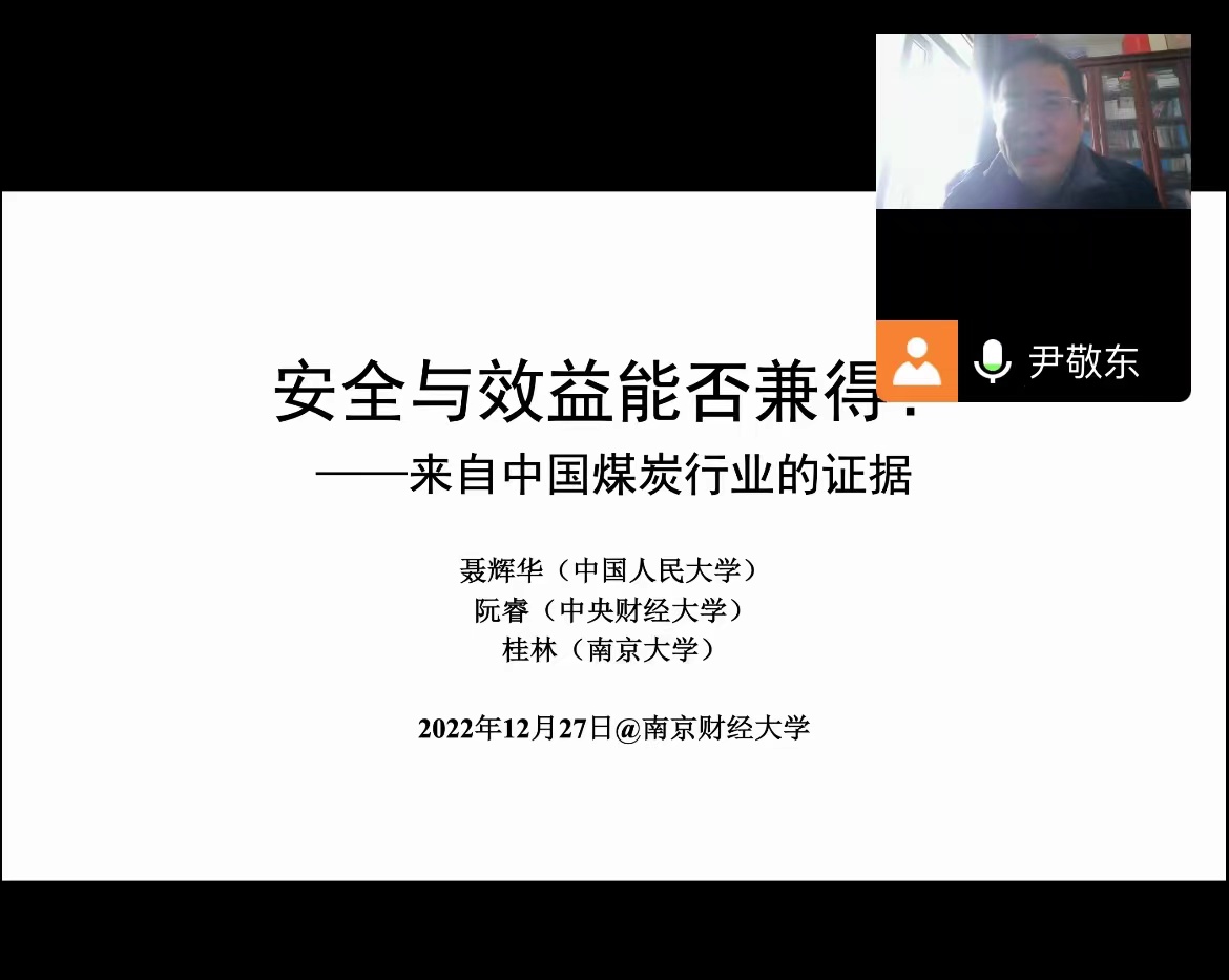12月27日下午,中国人民大学经济学院教授、博士生导师聂辉华在线上为我院师生带来题为“安全与效益能否兼得?——来自中国煤炭行业的证据”的学术报告。本次讲座由经济学院副院长尹敬东教授主持,经济学院师生聆听此次报告。