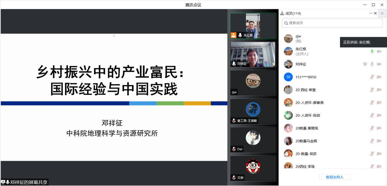 5月20日下午,中国科学院地理科学与资源研究所邓祥征研究员应邀为我院师生作题为《乡村振兴中的产业富民:国际经验与中国实践》的线上学术报告,报告由院长朱红根教授主持,来自经济学院和全校其它学院的100多位师生聆听了此次讲座。