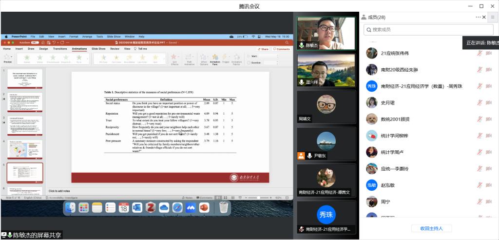 5月18日下午,我院在线上成功举办了双周学术论坛。本期论坛由经济系讲师陈敏杰带来题为《Pro-environment behavior in a social context: evidence from waste-sorting in rural China》的学术报告。尹敬东副院长主持了本次论坛,经济学院部分师生参与。
