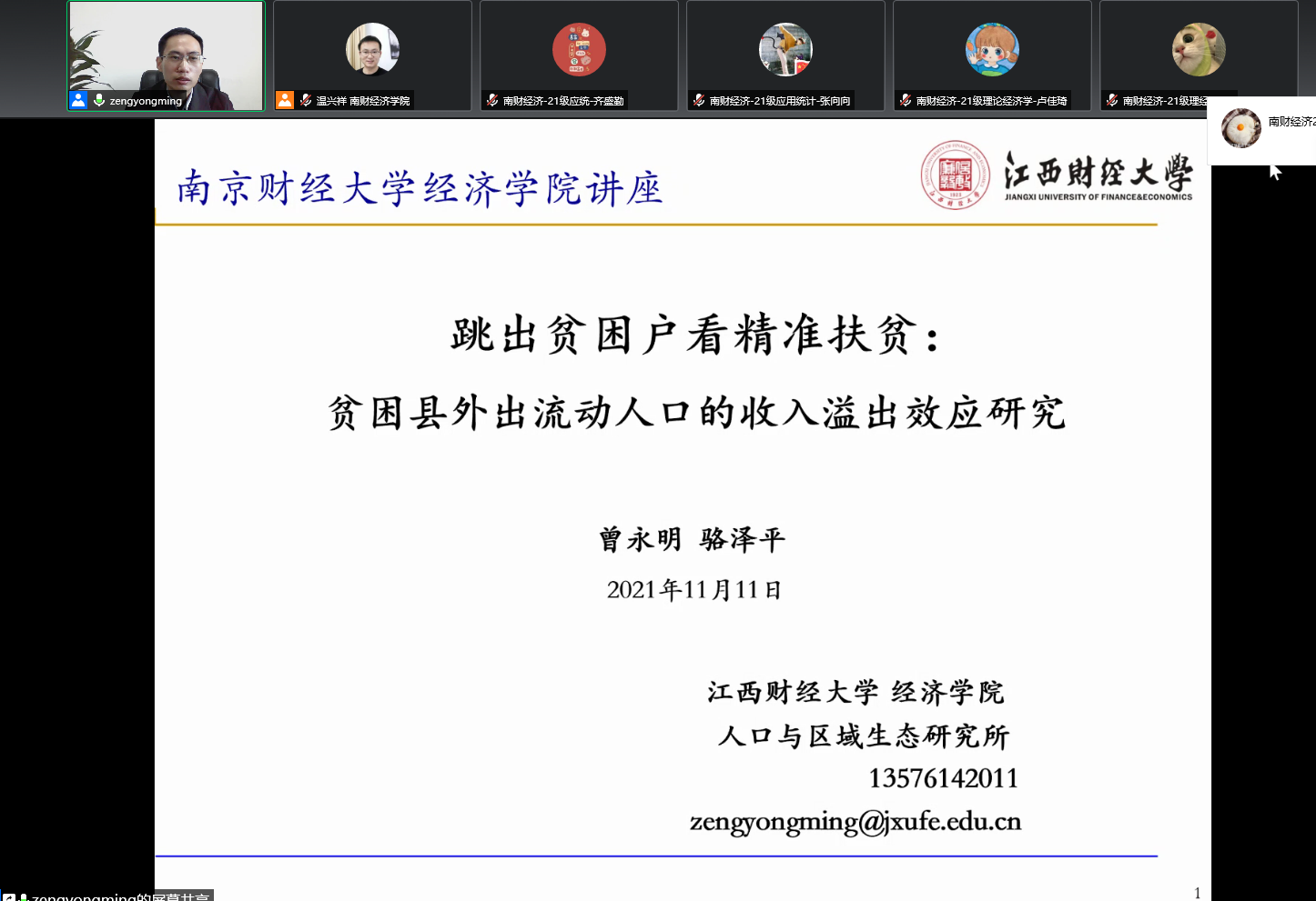 11月11日上午,应我院邀请,江西财经大学经济学院曾永明副教授在线为我院师生作了题为“跳出贫困户看精准扶贫:贫困县外出流动人口的收入溢出效应研究”的学术报告。报告由学院温兴祥老师主持,学院部分教师和研究生参与了此次讲座。