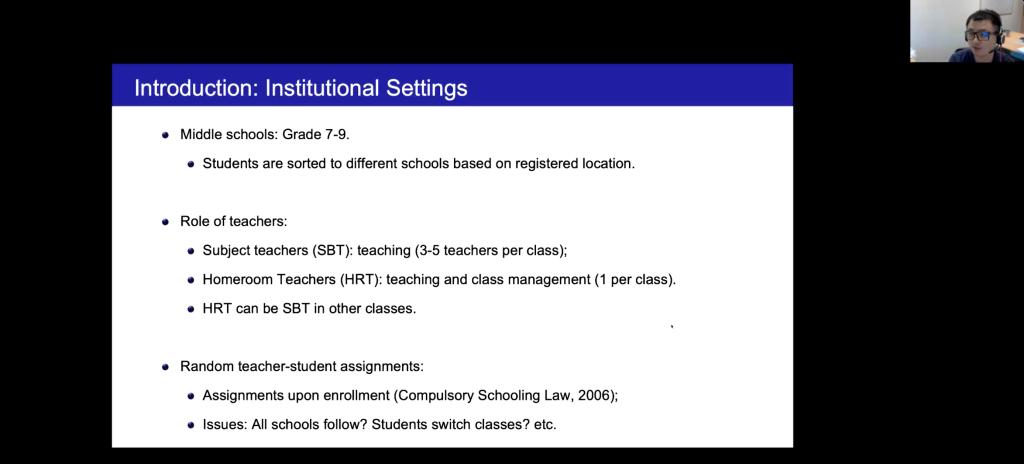 12月30日下午,应我院邀请,新加坡国立大学校长特聘助理教授黄炜博士通过腾讯会议为我院师生作了题为“Teacher Characteristics and Student Performance: Evidence from Random Teacher-Student Assignments in China”学术报告。报告由沈煜博士主持,我院师生聆听了此次学术报告。