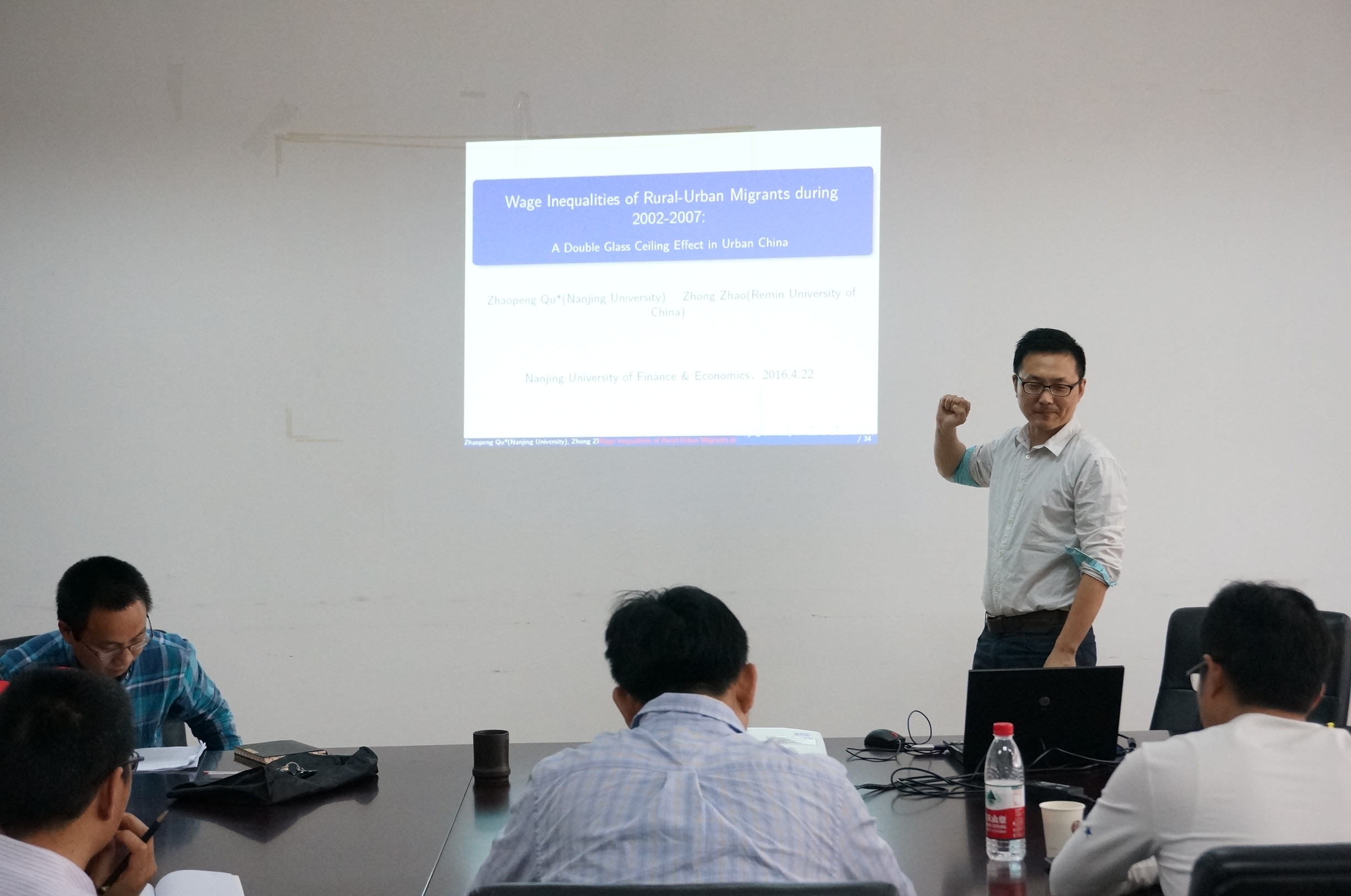 4月22日下午2点,经济学院“长三角收入分配与经济增长”学术论坛迎来第6次报告,本次主讲人为南京大学的曲兆鹏老师,他为大家带来的精彩报告是——“Glass Ceiling in Urban China: Wage Inequality among Rural-Urban Migrants during 2002-2007”。经济学院部分教师和研究生参加了本次学术活动,讲座由经济学院叶林祥老师主持。