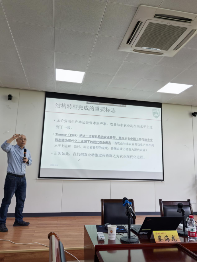2025年4月18日上午,应经济学院邀请,中国农业大学领军教授蔡海龙教授在德经楼307会议室,带来一场题为“结构转型视角下的农业现代化:普遍规律与中国实践”的学术讲座。经济学院院长刘小峰教授主持,众多师生参与。