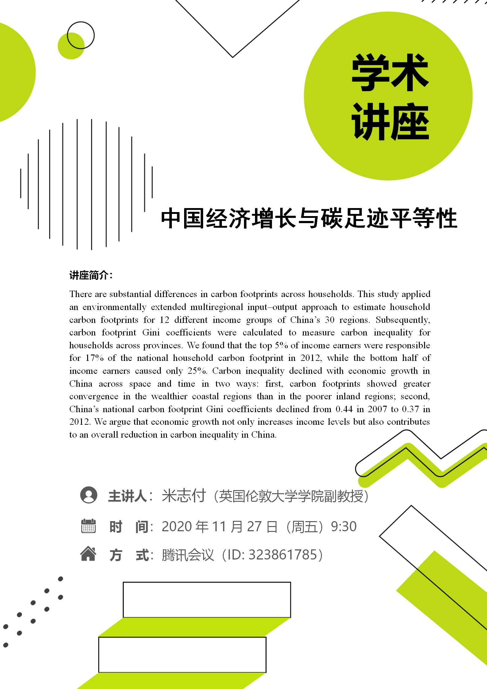 学术讲座预告:中国经济增长与碳足迹平等性