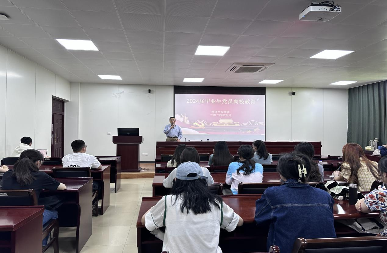 为加强毕业生党员教育,激励全体毕业生党员坚定信念,以饱满的青春热情、良好的精神风貌踏入人生新征程。2024年5月16日,经济学院党委开展2024届毕业生党课,此次党课由学院党委书记张圣兵主讲,学院组织员黄晓娟主持,全体毕业生党员参加。