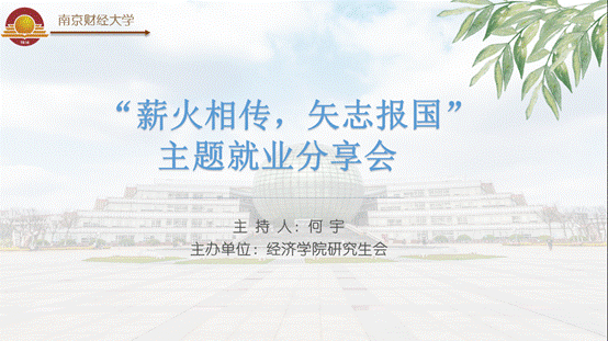 本次活动邀请到17级西方经济学的丁柏超、陈伟和18级应用统计的张振宇三位毕业班研究生,他们分别在求职、考博和就业方面取得了较为突出的成绩。活动过程中,丁柏超同学从职业方向选择、简历投递、笔试准备与面试发挥等方面讲述了自身的求职经历,并积极鼓励研究生同学们在一次次面试过程中积累发散性思维、培养严密的逻辑体系,也要提高语言表达能力,以期更好地回答面试官的问题。陈伟同学分享了考取上海财经大学博士生的经验,强调了研究生期间作出良好成果对于后期学校选择的重要性,他认为扎实的专业基础知识、高效的时间管理计划与良好的身体素质是使自身在竞争中脱颖而出的关键原因。张振宇同学分析了我院研究生历年的就业趋势,又详细从公务员的备考安排、资料准备与面试经验等角度启发同学们如何把握当下机会,作出适合自己的选择。