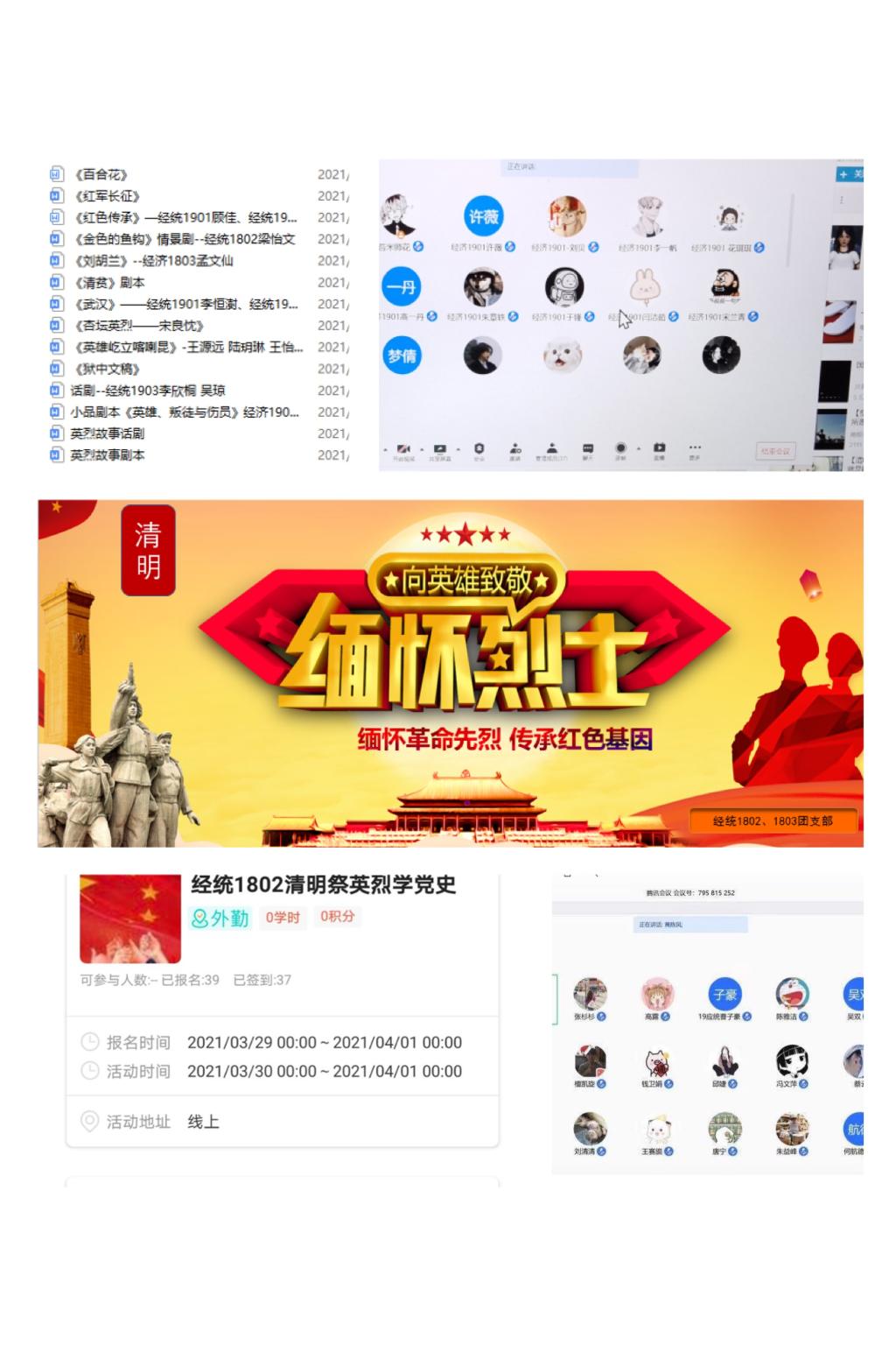 为引导广大青年学生缅怀革命先烈,发扬革命先辈的优良传统,传承红色基因,继承革命精神,经济学院开展了“缅怀革命先烈,传承红色基因”清明主题教育系列活动,通过线上学习、主题党团日、网上祭英烈、征集红色革命故事剧本、话剧表演等形式,让学生在活动中受教育、在力行中担使命。