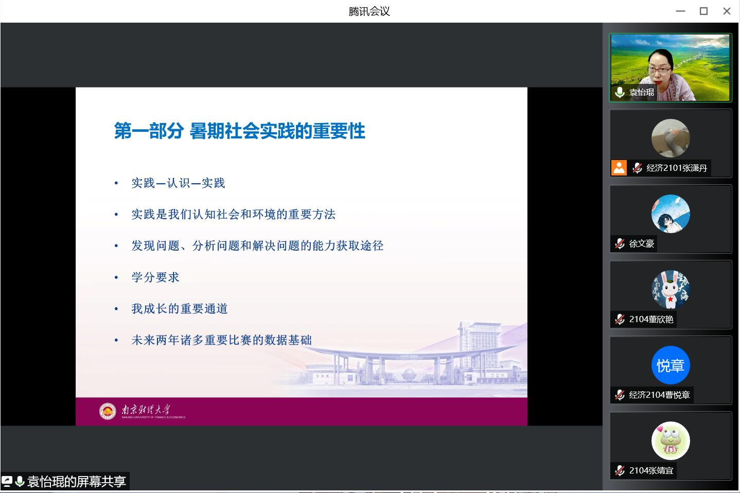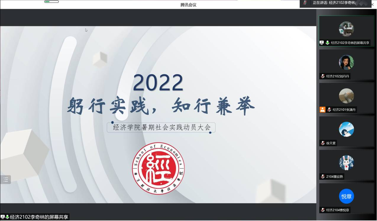 为进一步加深大学生对基层工作的了解鼓励大学生参与实践、走进基层、发挥自身专业特长和聪明才干,号召大学生为家乡的发展助力,6月1日晚,我院于线上召开“躬行实践,知行兼举”——经济学院2022年暑期社会实践动员大会。本次大会邀请我院党委副书记袁怡琨,优秀指导教师吴昊老师,校团委副书记(挂职)、我院辅导员梁少颖老师以及我院团委书记潘怡老师进行讲解说明,往期优秀项目负责人同学分享实践经验,全院两百余名同学参加活动。