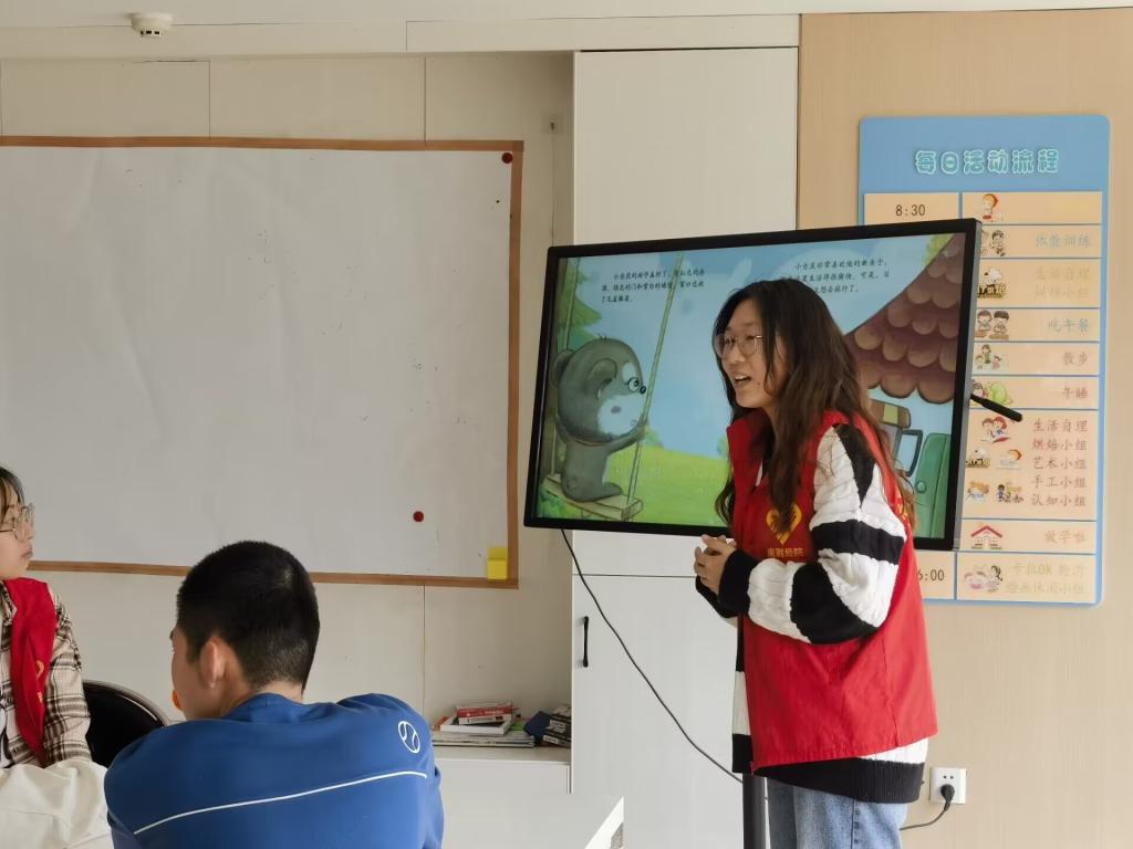 来到雨花睿泽,志愿者们首先通过大屏展示图书配以解说的形式,为服务中心的学员们带来了一场生动有趣的故事分享会的。爱唱歌的小鸭子让学员们懂得了了天道酬勤的道理,爱旅行的小仓鼠让他们感受到了众志成城的力量。现场生动有趣,欢声笑语。