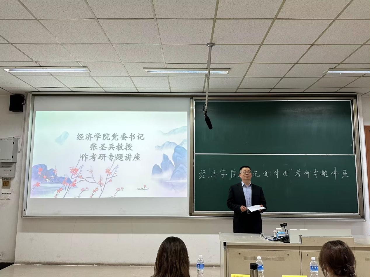 随后,党委书记张圣兵教授从考研选择、复习备考、就业择业等方面作考研专题分享。他结合自身经历,讲述了自己从北京师范大学政治经济学本科毕业后投身工作,而后又到北京大学经济学院助教进修班进修,最后又作为北京师范大学经济学博士毕业的求学之路。张圣兵书记鼓励同学们积极考研升学,引导同学们明确人生道路选择,充分了解升学就业趋势,为自己提供更高的发展平台。