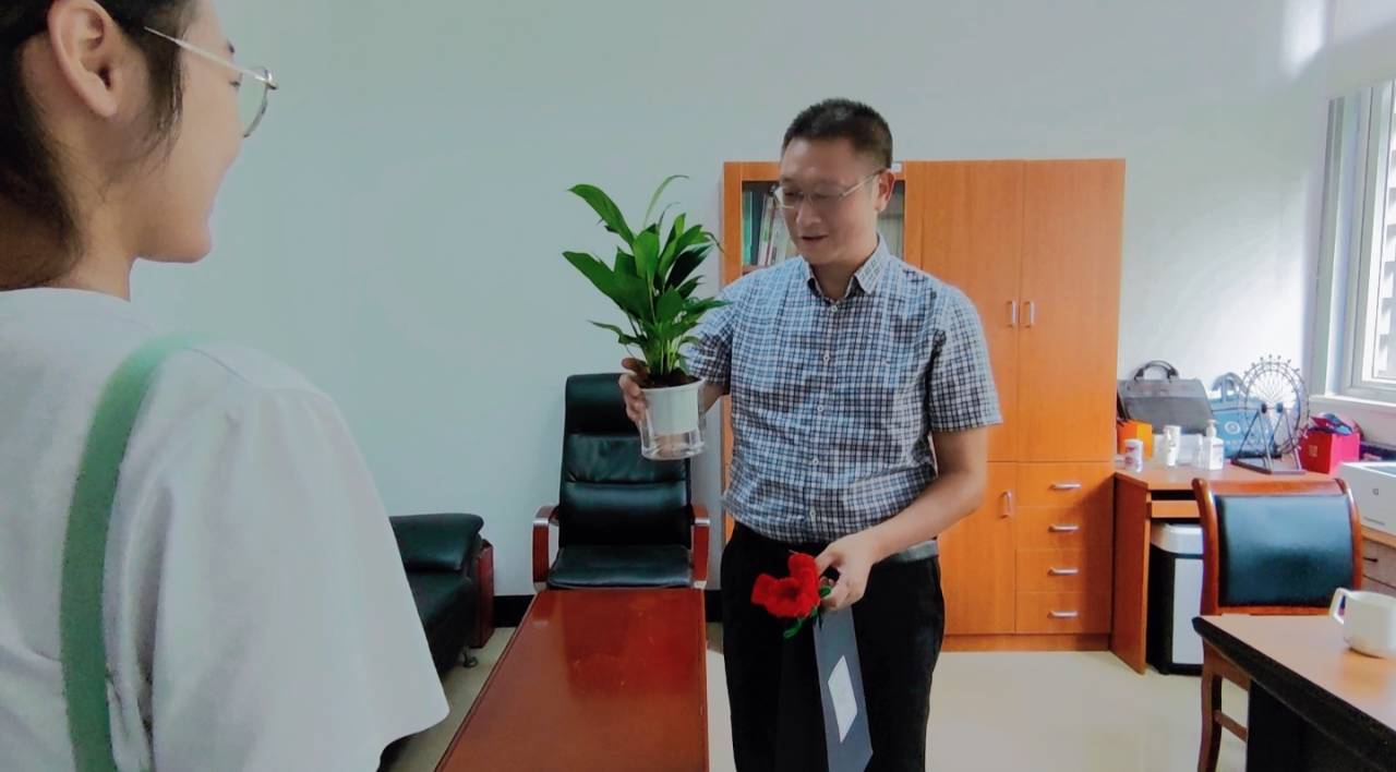 “朱院长,马上就要教师节了,祝您教师节快乐!这是送给您的种子盲盒和绿植,感谢您的精心呵护,我们一定茁壮成长!”同学们向朱红根院长献上最真挚的教师节祝福。