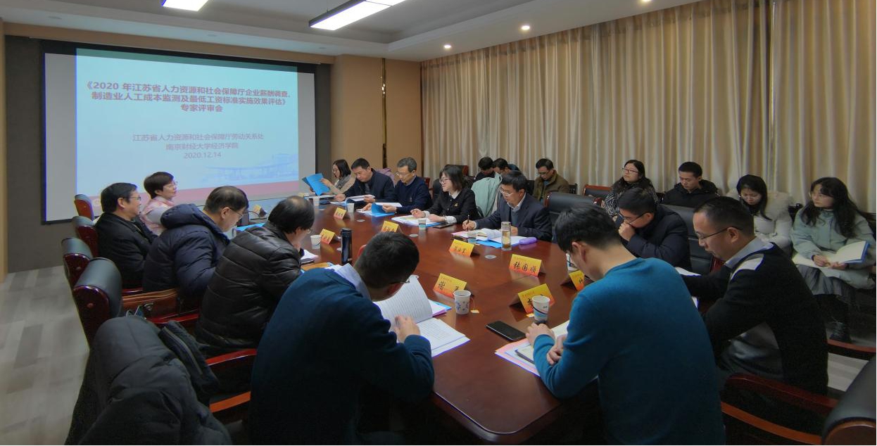 的科研和社会服务提供持续的支持。我校教务处处长、最低工资标准实施效果项目负责人叶林祥教授向评审专家汇报了《2020年江苏省最低工资标准实施效果评估报告》。企业薪酬调查和制造业人工成本监测项目负责人王万珺副教授汇报了《2020年度江苏省企业薪酬调查报告》。各位评审专家在认真听取了汇报后,认为项目资料搜集充分,研究扎实,政策建议具有较强的针对性和可操作性,对报告从形式到内容也提出了许多中肯的建议及完善和修改意见。课题组成员对专家们的意见和建议表示了感谢,并表示会后将在专家建议的基础上认真修改完善报告。