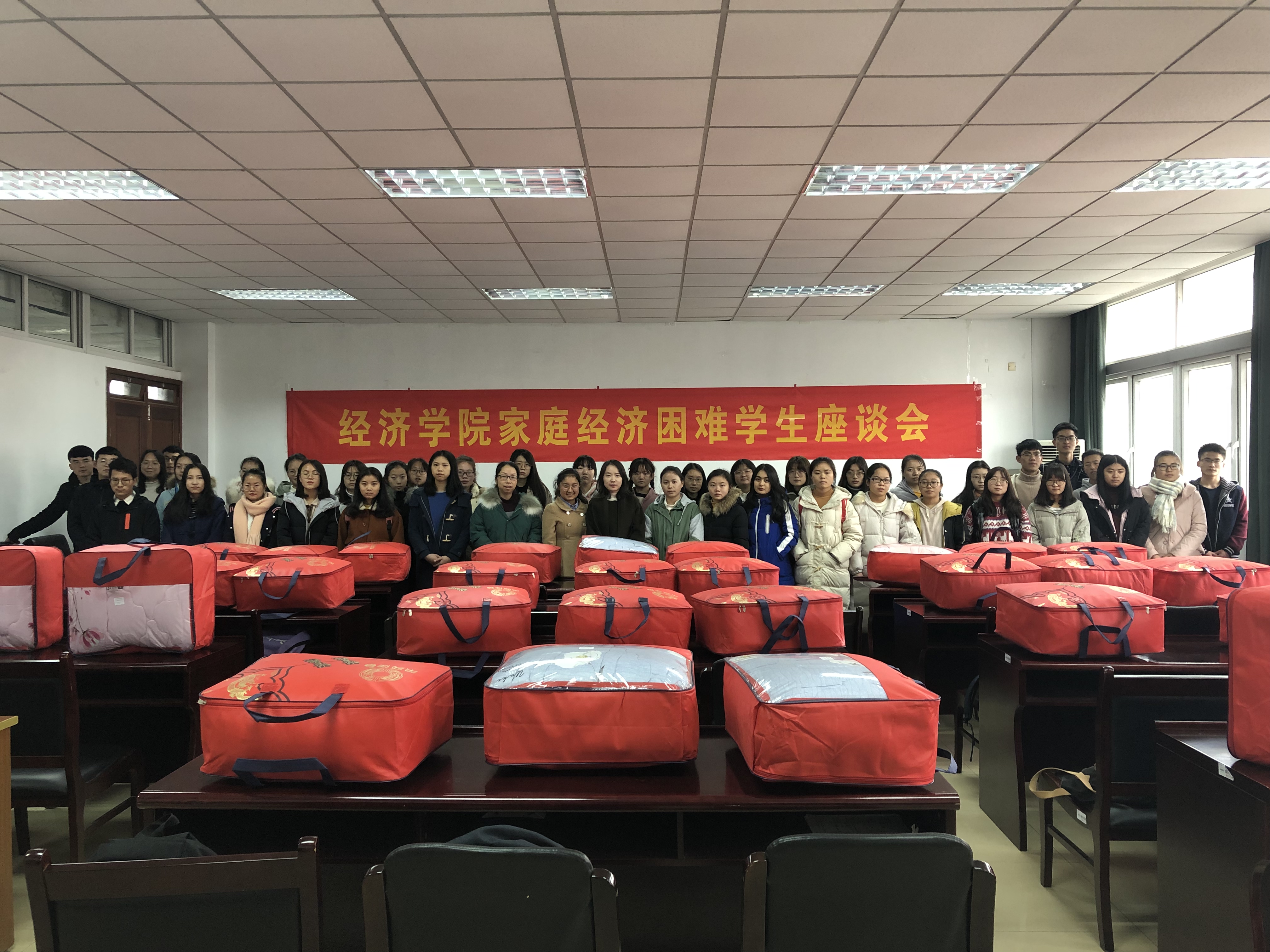 座谈会后,老师们为每一位同学发放御寒冬被,为学子们在寒冷的冬天送上一份温暖和祝福,预祝困难学生们在即将到来的期末考试中取得优异的成绩。