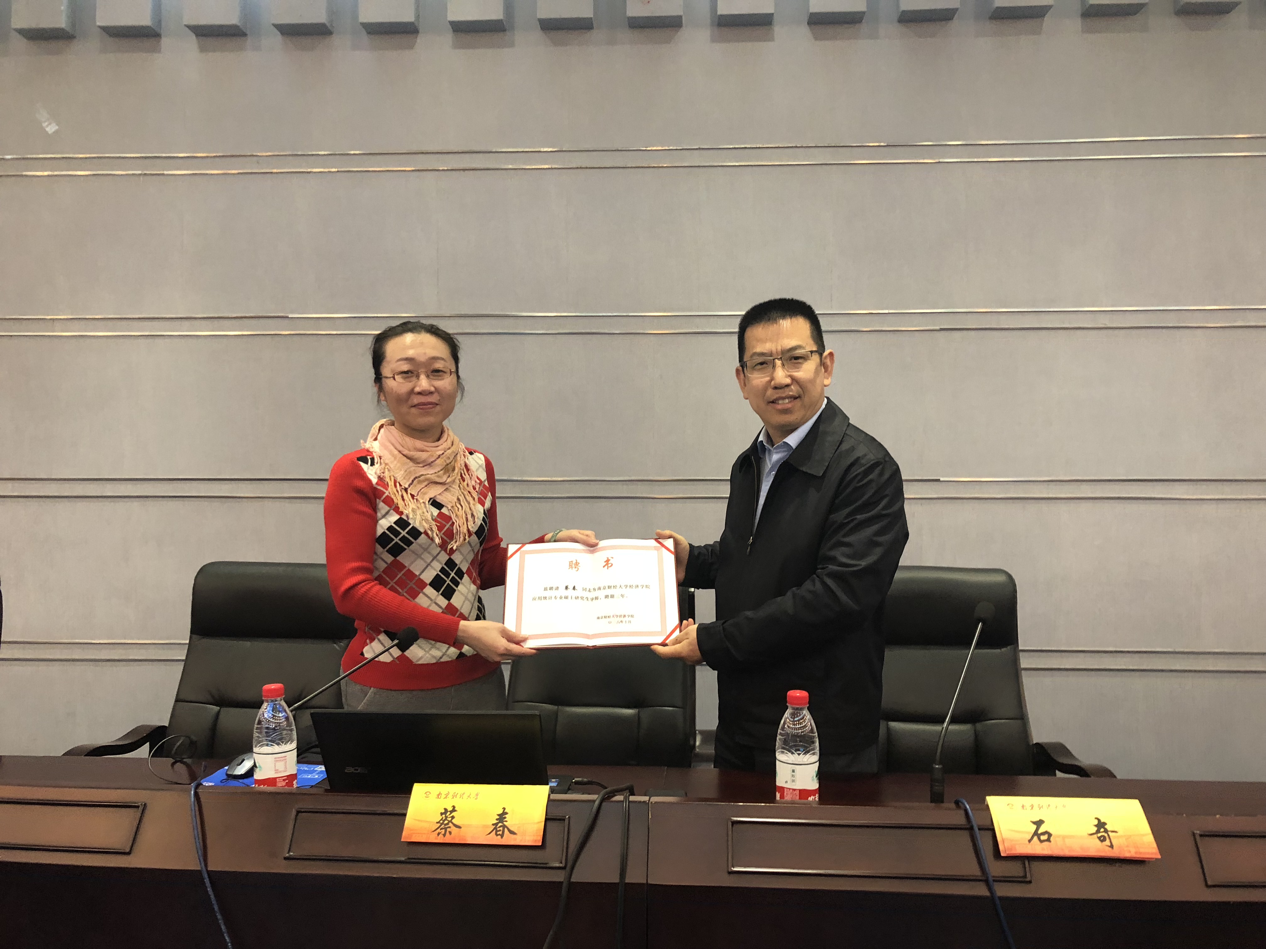 院长石奇为蔡春女士颁发应用统计专业硕士研究生导师聘书。受聘仪式结束后,蔡春女士还与现场的师生围绕科学研究、本科和研究生教学等方面进行了热烈交流。