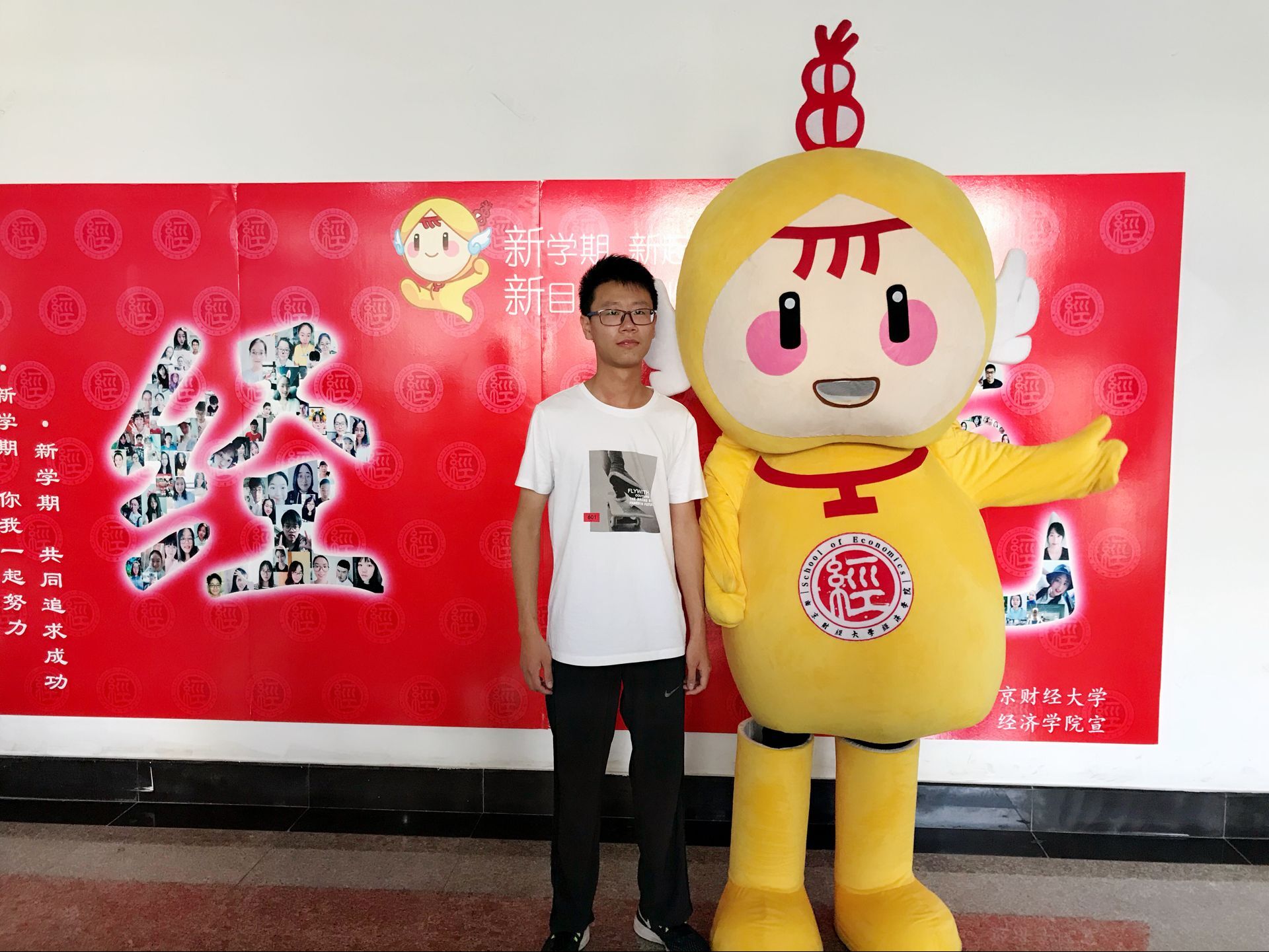 吉祥物“小经灵”:黄色的衣服、憨态可掬的笑容,打招呼、卖萌、求拥抱、求合影,让初来学院的新生们感受到大学的轻松和温暖。登记结束后,新生和家长们在由新生笑脸照片分别拼成的“经“和”统”字样的照片墙处与小经灵合影留念。宋学锋校长和邱伟芬副校长也在百忙之中亲临迎新现场,了解新生的入学情况,并与小经灵合影。