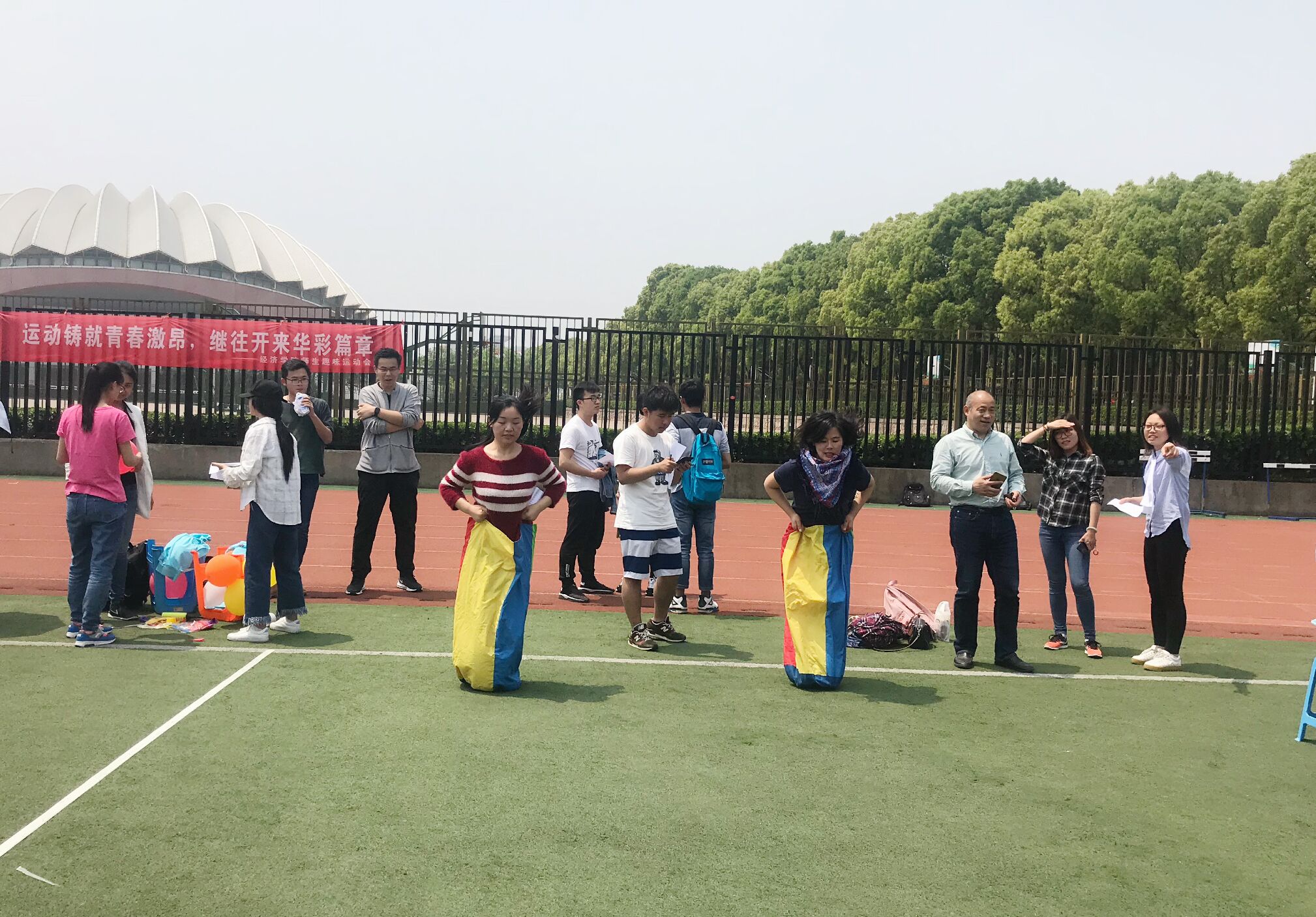 “砥砺前行”比赛中,师生组抓稳节奏,从容不迫,在一分钟内一人用筷子将第一个碗里的乒乓球夹到第二个碗里,另一人用吸管将第二个碗里的乒乓球吸到第三个碗。“跨越入世”比赛中,师生穿上麻袋双腿并拢,奋力向前跳跃,交替完成来回的袋鼠跳。“南方的春天”中,教师和学生穿上黑料网