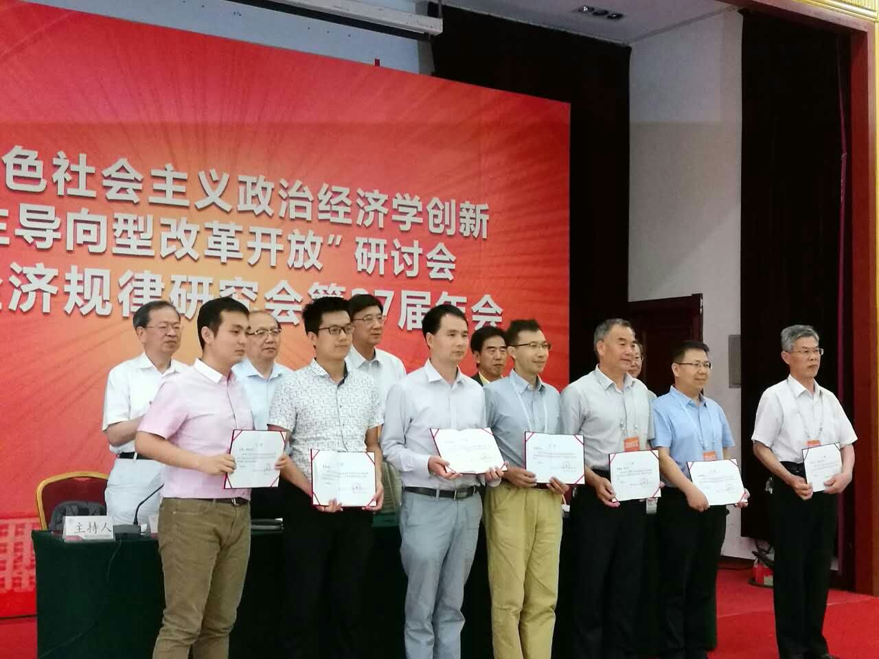 近日,由中国经济规律研究会主办,南开大学经济学院、全国中国特色社会主义政治经济学研究中心、中国特色社会主义经济建设协同创新中心等单位承办的“中国特色社会主义政治经济学创新与民生导向型改革开放”研讨会暨中国经济规律研究会第27届年会在南开大学举行。我院政治经济学专业硕士研究生王松(前排左二)提交的论文《与中国特色社会主义政治经济学:逻辑起点与体系构建》获得优秀论文奖。