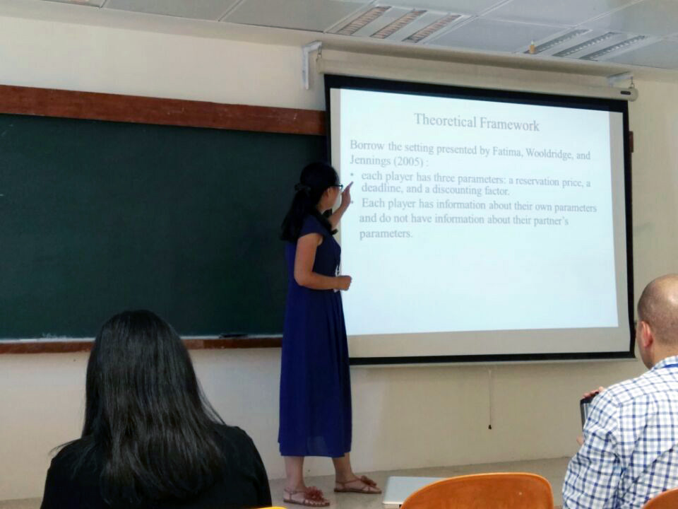 近日,我院黄姗姗博士远赴以色列耶路撒冷参加2016年经济科学协会世界大会,并作题为“互惠原则在内生匹配型双边谈判中作用机制的实验研究”报告。