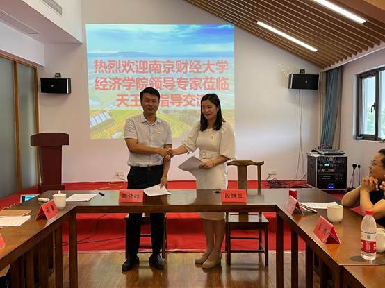 接着,地方政府官员和与会专家们进行了自由交流,戴庄村党委姚伟超书记向专家们介绍了戴庄村如何通过党委领导下的合作社引领绿色发展、重点发展生态农业、坚持城乡融合发展而实现乡村振兴的成功经验。戴庄村党支部和经济学院经济系教工党支部就合作共建内容进行了热烈讨论,达成一致后,经济系教工党支部段继红书记代表支部和戴庄村党委姚伟超书记进行了党支部共建协议签约仪式。学院党委袁怡琨副书记代表经济学院与戴庄村姚伟超书记签署了大学生社会实践基地协议书。