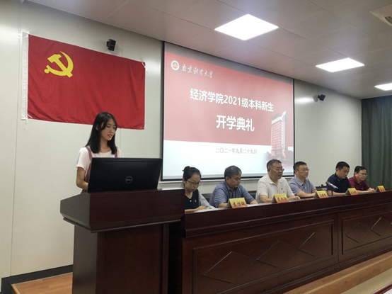 在校生代表经统1901班陆丽珏同学对小萌新们的到来表示热烈欢迎。并分享了自身对大学生活的几点感悟:潜心治学、互助友善、开拓创新。“恰同学少年,风华正茂;书生意气,挥斥方遒”,鼓励学弟学妹们不负青春韶华,争做新时代文明大学生。新生代表2106班王丹丹同学发言,立志秉承校训,做到“志存高远,树立明确目标”“向阳而生,心怀梦想”“不忘初心,砥砺前行”,成为推动新时代前进和发展的蓬勃力量!