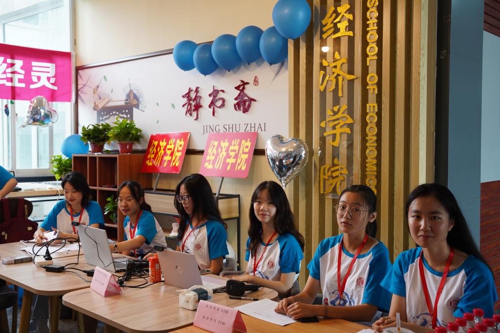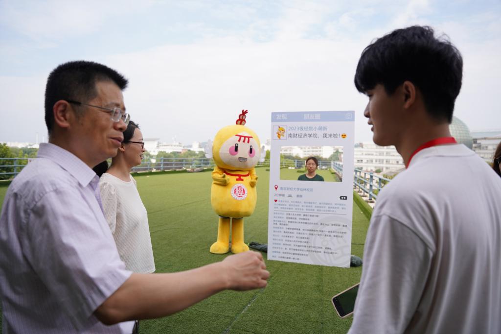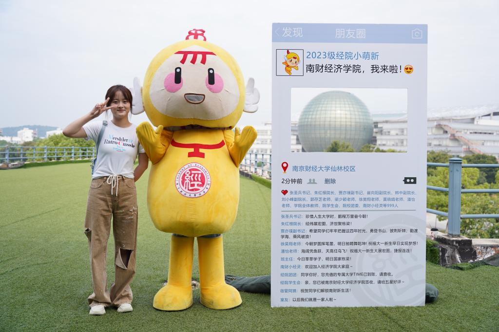 定制礼物,温暖满满。学院设置了从南财经济学院启航驶向星辰大海的“逐梦青春号”船票展板,学院的专业楼德经楼为船舱、新生们的学号为证件号,寓意经院学子们登船开启为期4年的学习时光,乘风破浪,扬帆远航,逐梦新征程。学子们在船票票根写下求学寄语并签名后粘在迎新墙上,更增强“榜上有名”的仪式感。学院还精心为新生准备了富有经院特色的入学纪念品,包含“小经灵”钥匙扣、船票票根、南财明信片、新生防诈骗指南以及定制帆布包等,通过温馨礼物的方式密切学生和学院的联系、培养爱校情怀,可谓仪式感满满!新生们纷纷与写满学院领导老师点赞留言的朋友圈打卡框、学院吉祥物“小经灵”和南财地标图书馆“大球”合影,开启缤粉多彩、有滋有味的大学生活。