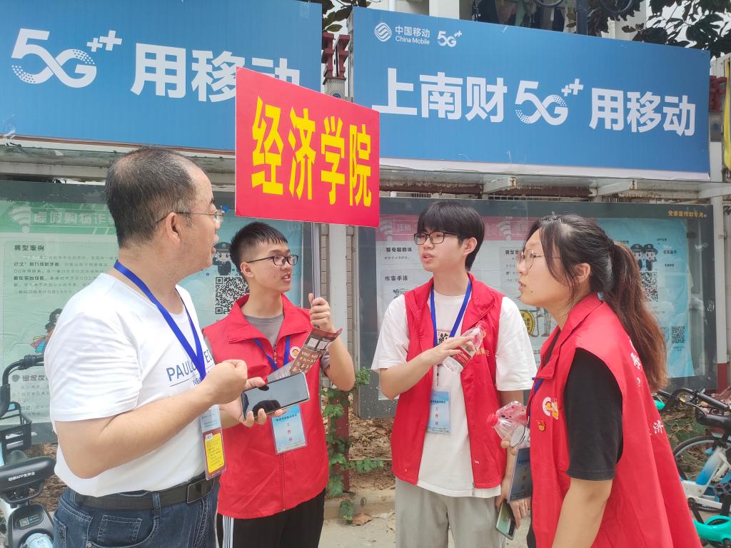 领导亲临,慰问关心。上午,学院党委书记张圣兵、院长朱红根、党委副书记贾亦璞及其他院领导早早来到学院迎新点了解新生接待工作与准备进展,认真查看新生报到每个环节,亲切慰问一线工作人员,并与现场师生志愿者、辅导员一起参与迎新工作。院领导们与新生亲切交谈,热情问候报到新生并为其耐心答疑,为绿色通道学生送去暖心大礼包,与大家亲切合影,欢迎他们在南财开启人生崭新篇章。今年的新生中有两名同学在报到当天迎来生日,学院为他们准备了生日蛋糕、贺卡和礼物,学院党委书记张圣兵、副书记贾亦璞到宿舍现场送上祝福。如沐春风的关怀驱散了新生们初来乍到的距离感,为新生们尽快融入经济学院大家庭及时注入“强心剂”。