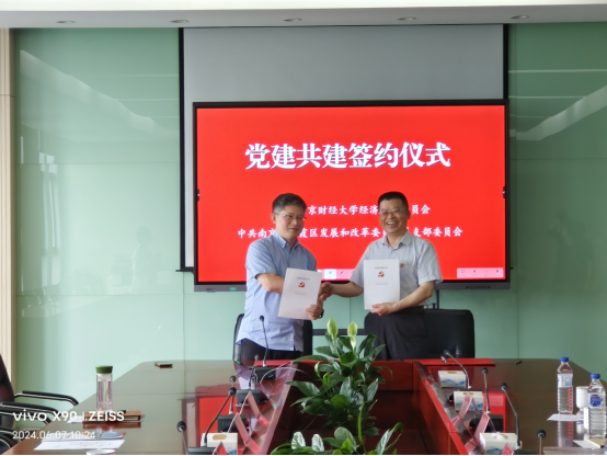 6月7日上午,经济学院与南京市栖霞区发展和改革委员会(以下简称“区发改委”)成功举办党建共建协议签约仪式。我院党委书记张圣兵、副院长崔向阳、区发改委党组书记、主任陆建尚出席签约仪式。区发改委党组成员、副主任杨霖、区发改副主任何蜀君以及经济学院党委委员、经济系教工党支部书记杨泳冰、统计系主任程恭品、经济系主任陈博欧参加签约仪式。此次党建共建协议成功签约,标志着我院在“一院一地”校地战略合作方面迈入新台阶。